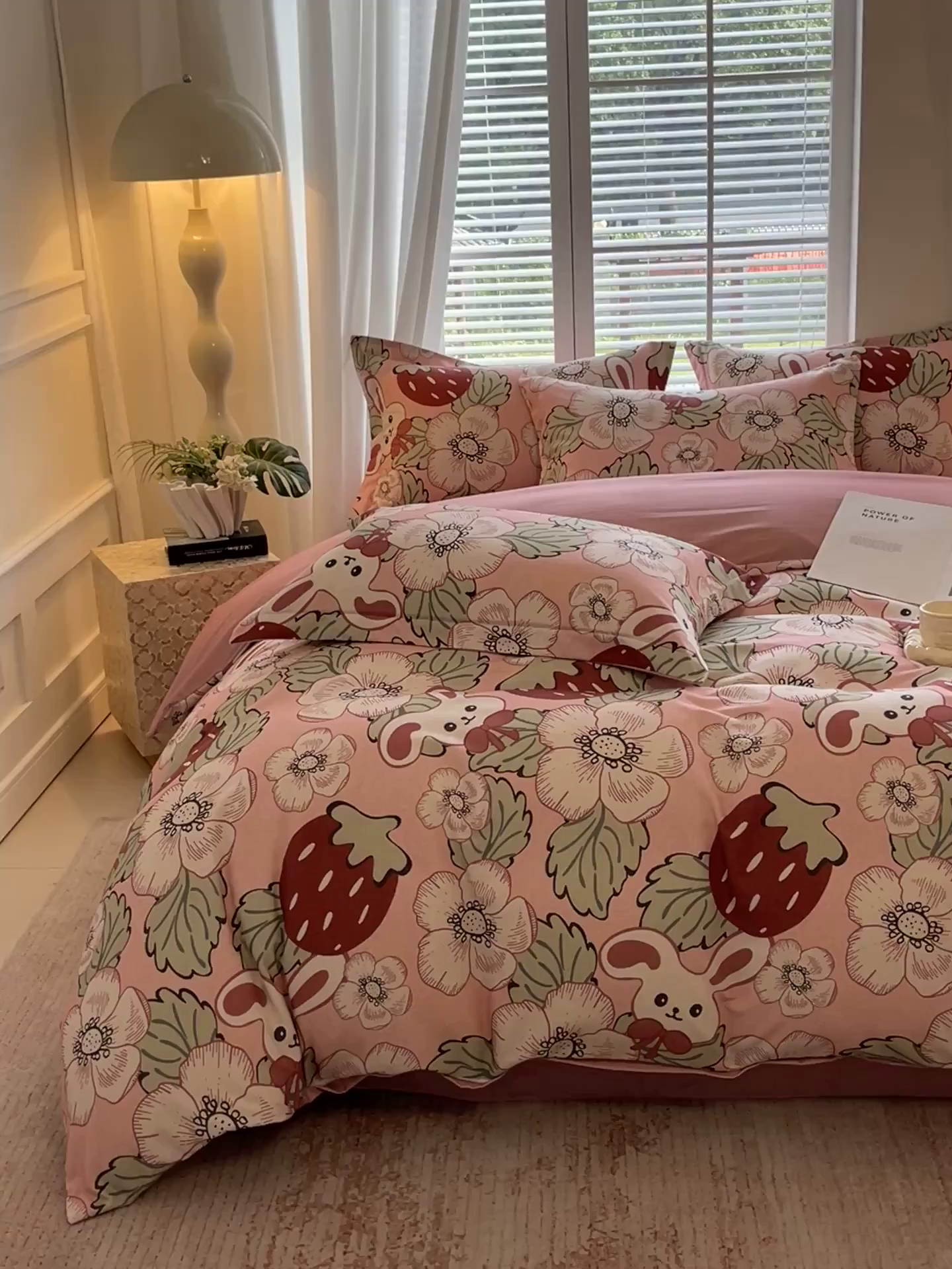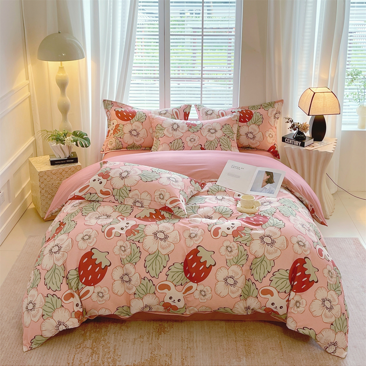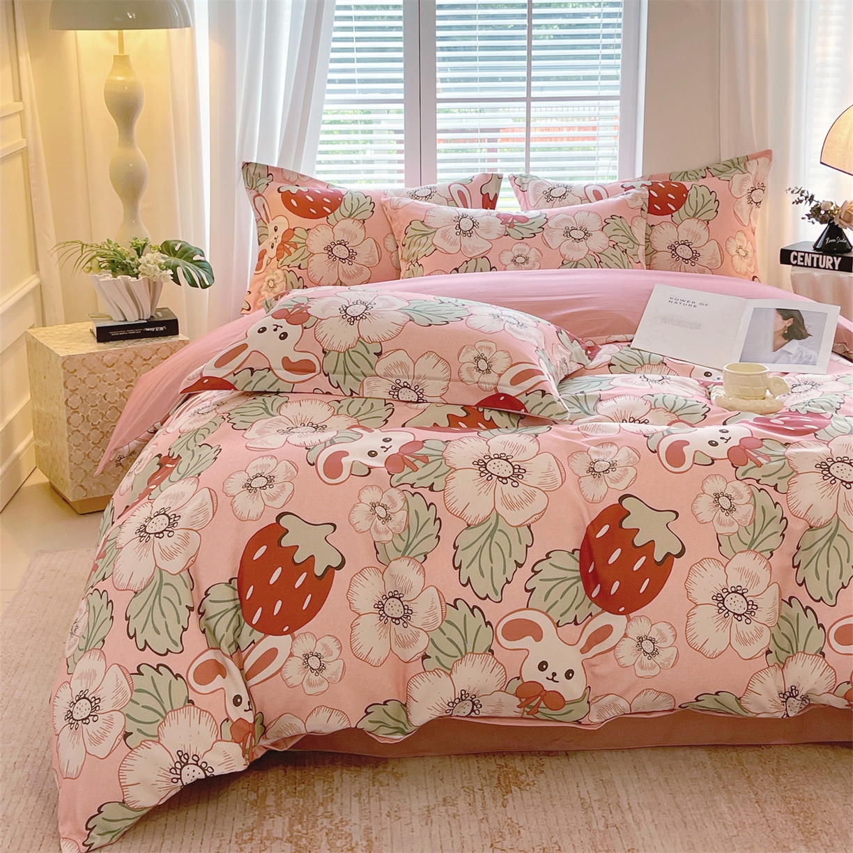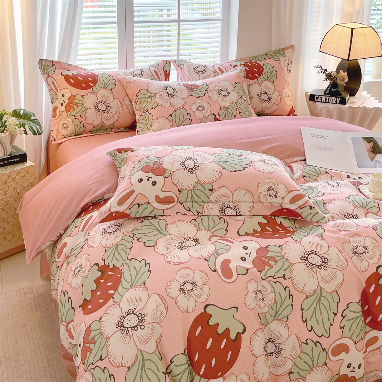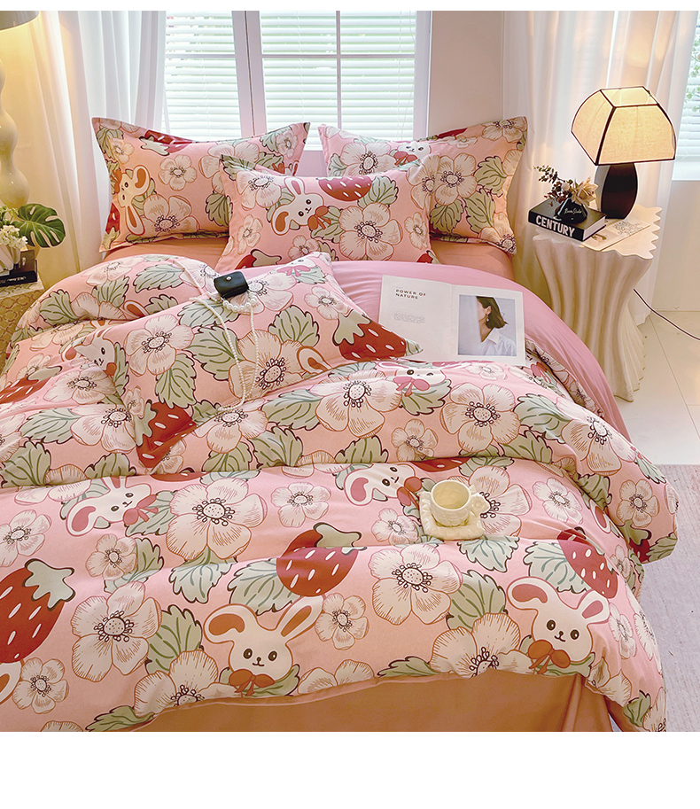 凯磊家纺 - 凯磊家纺 2025新款AB版加厚磨毛系列四件套 草莓小兔粉