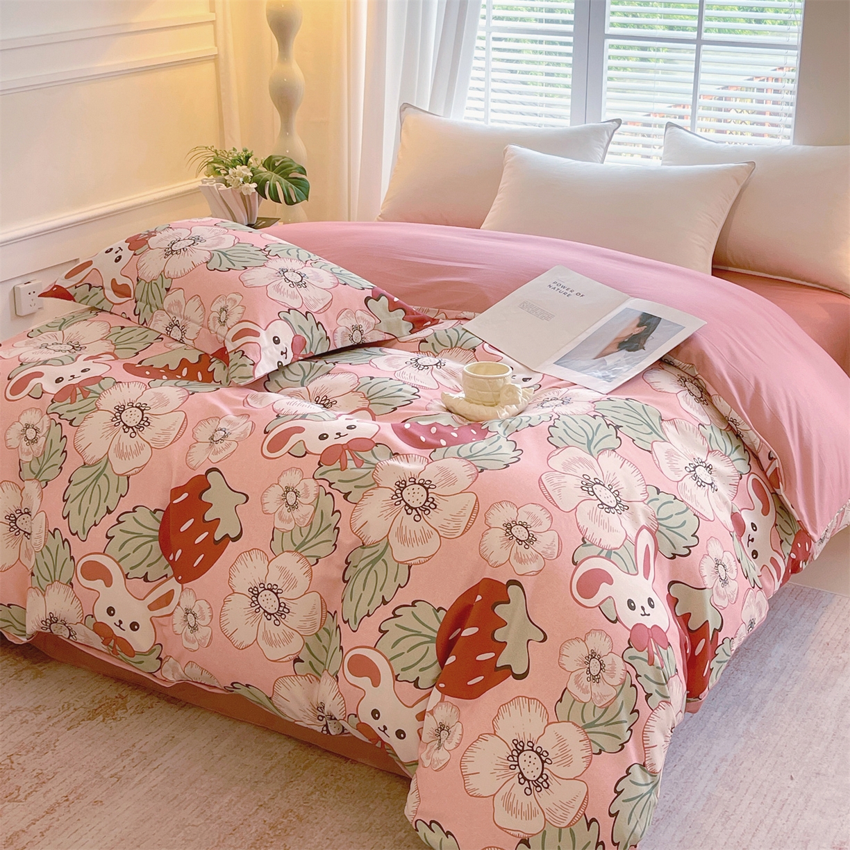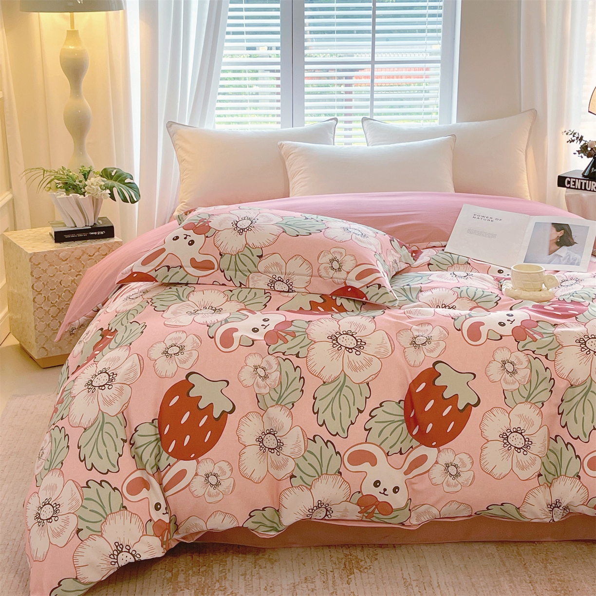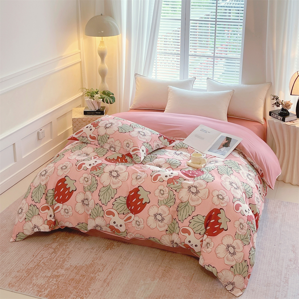 凯磊家纺 2025新款AB版加厚磨毛系列四件套 草莓小兔粉