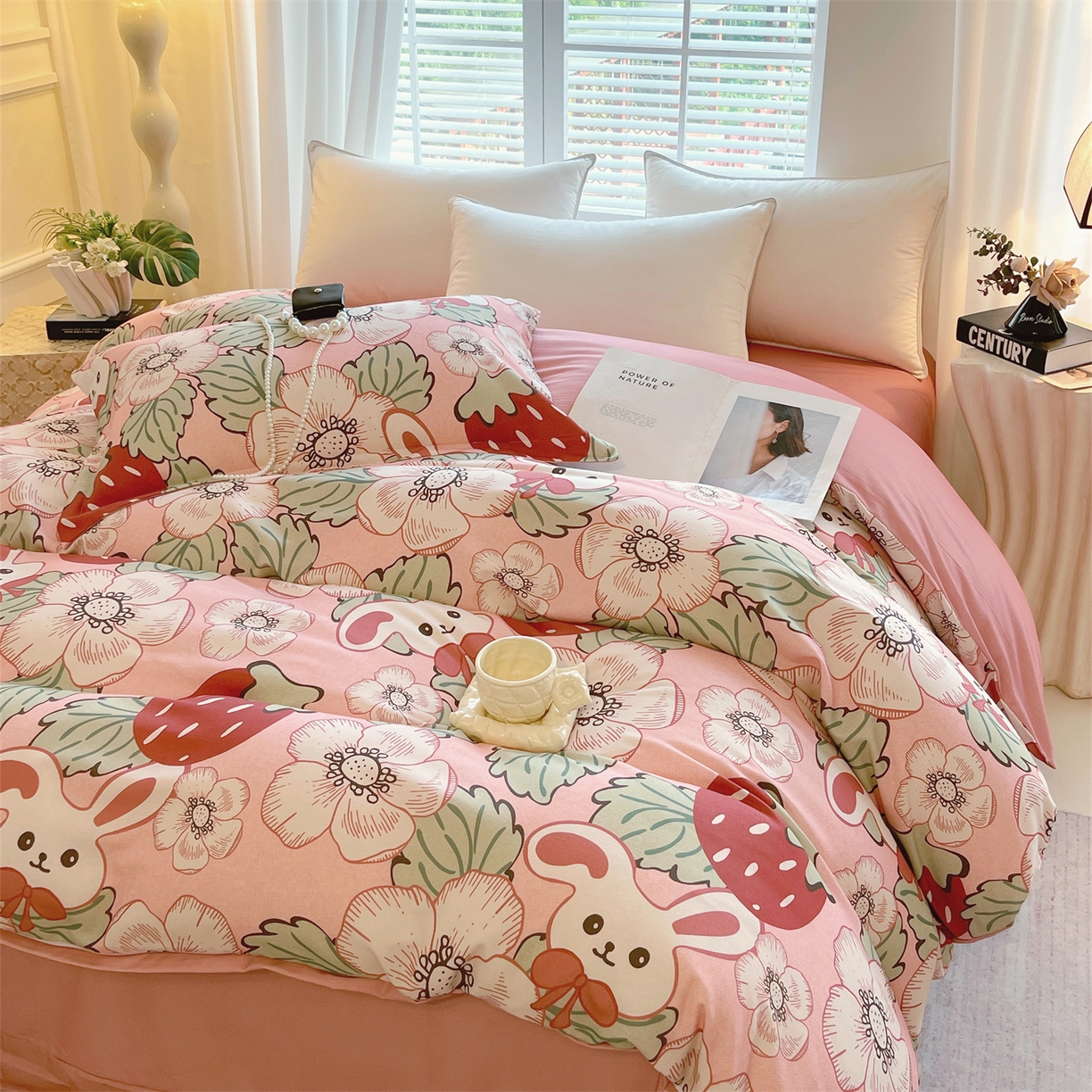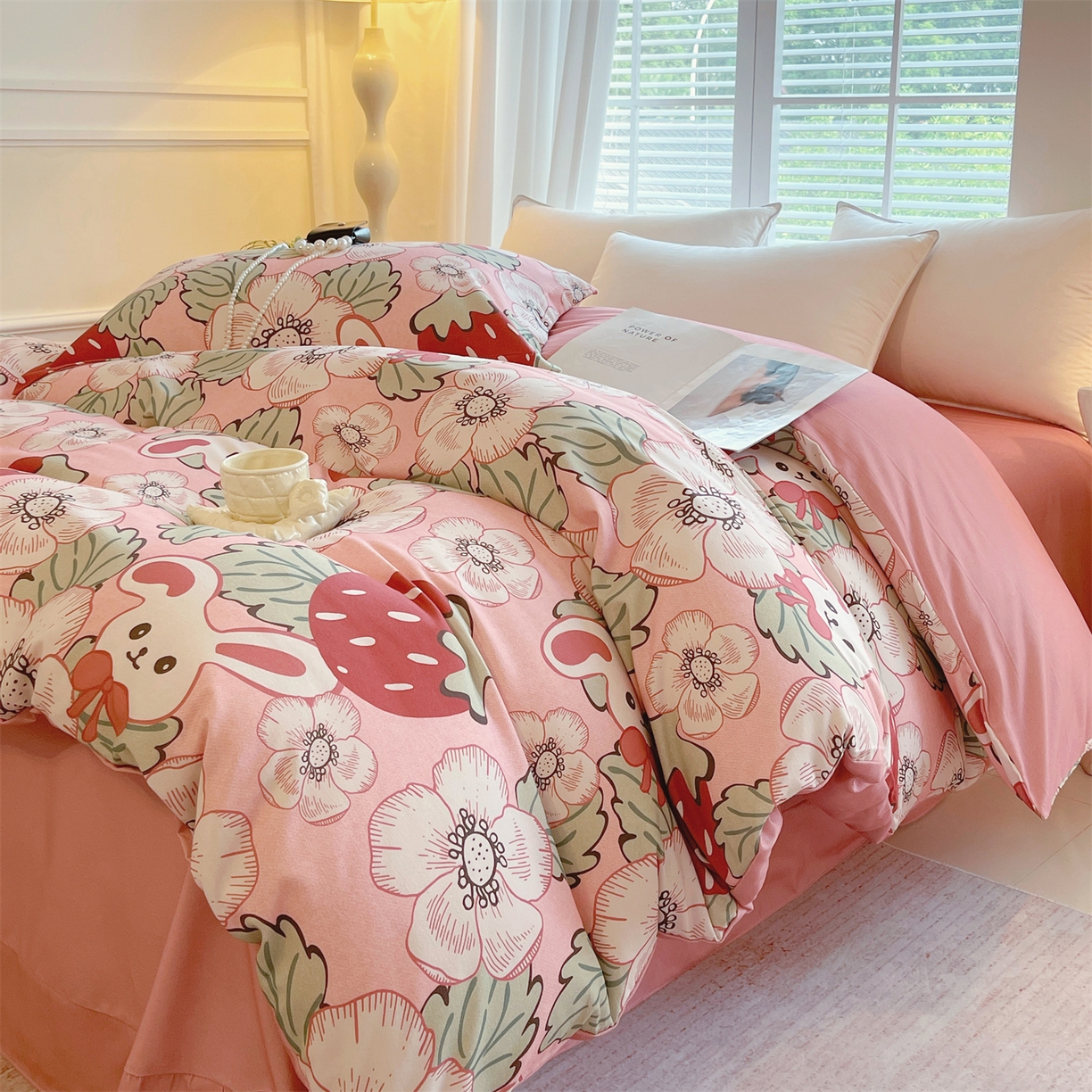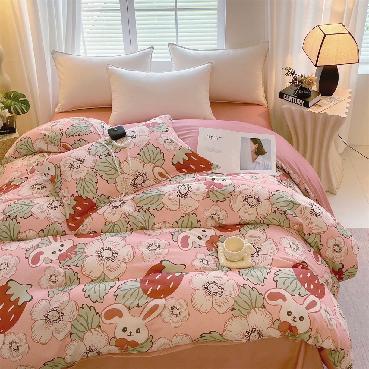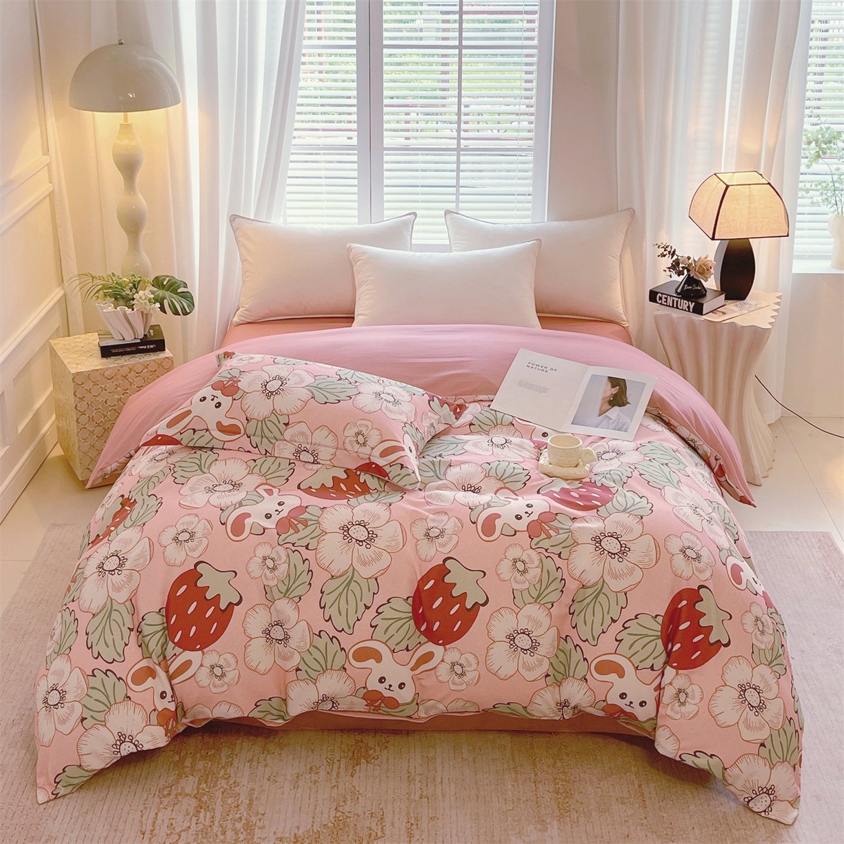 凯磊家纺 2025新款AB版加厚磨毛系列四件套 草莓小兔粉