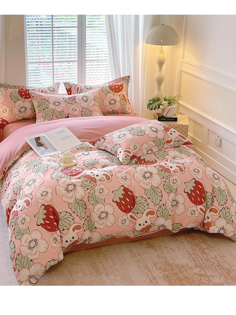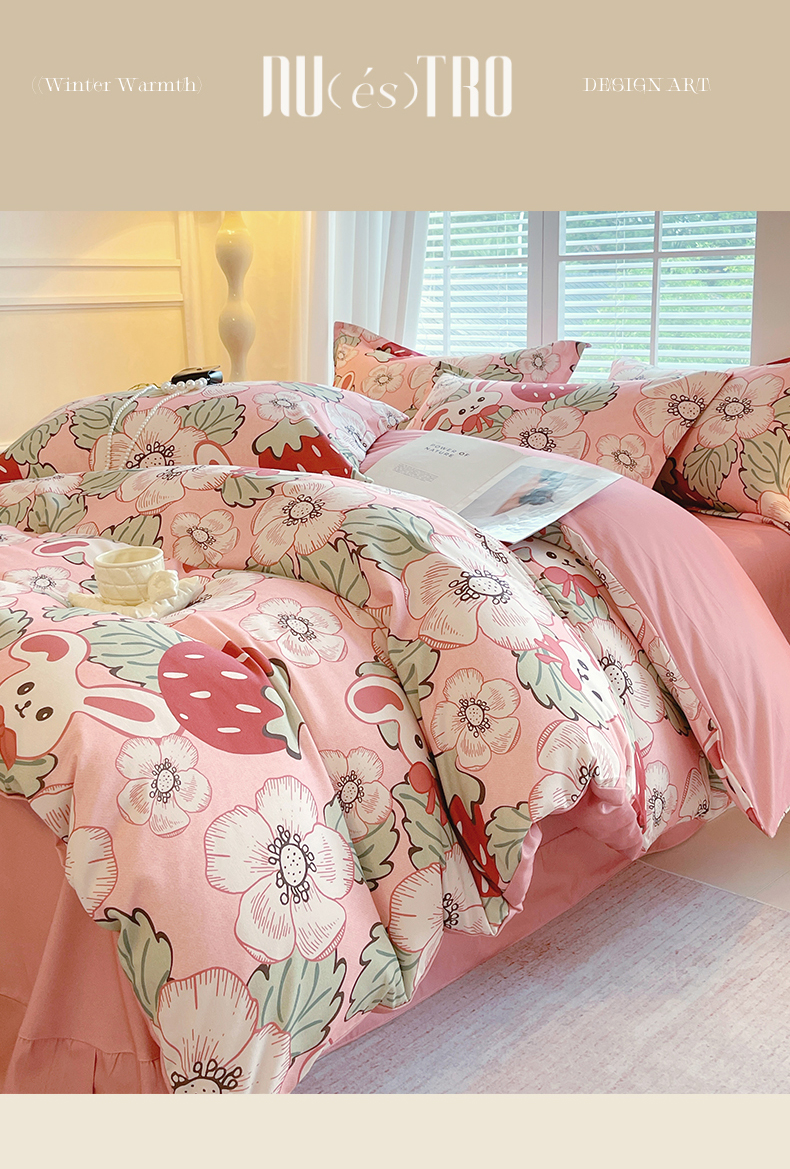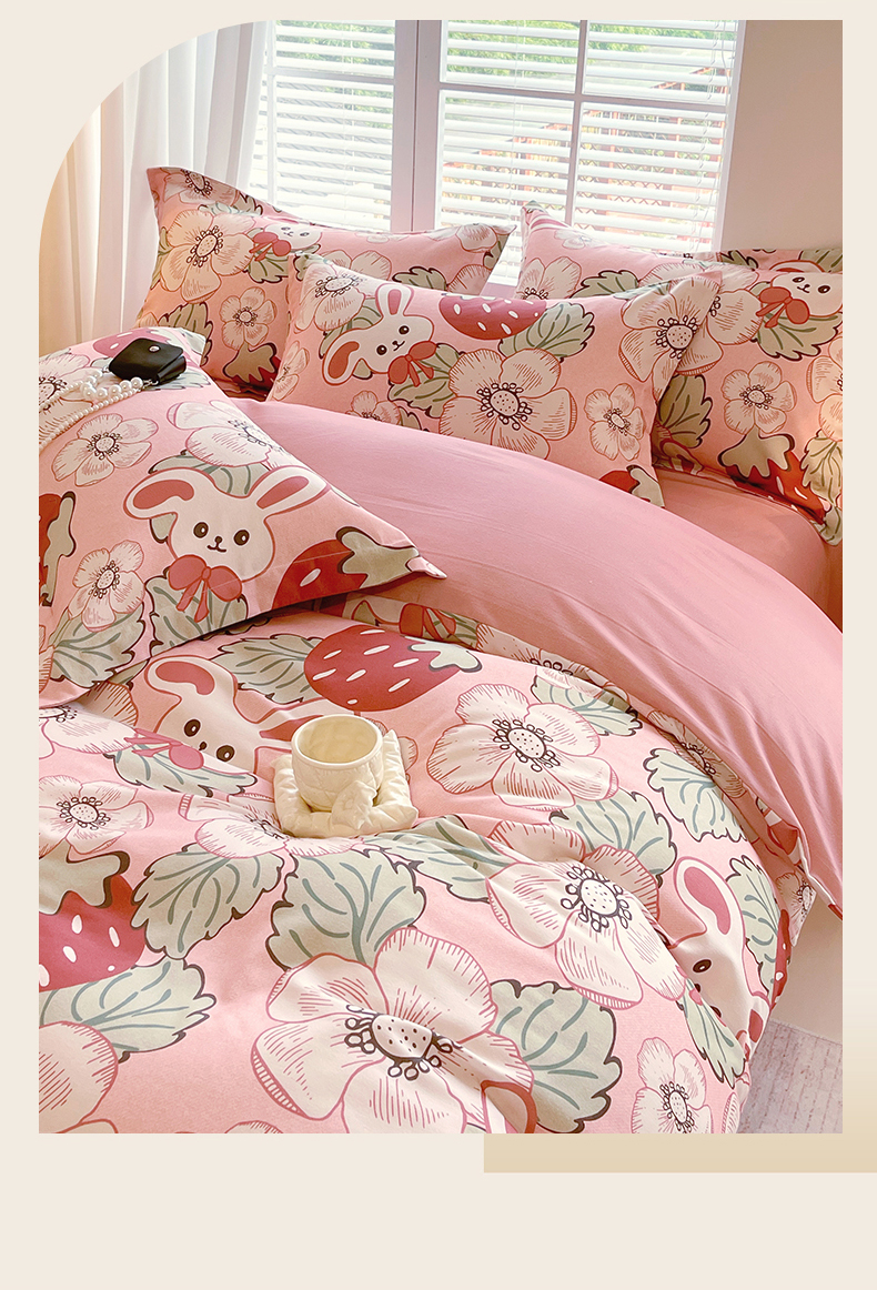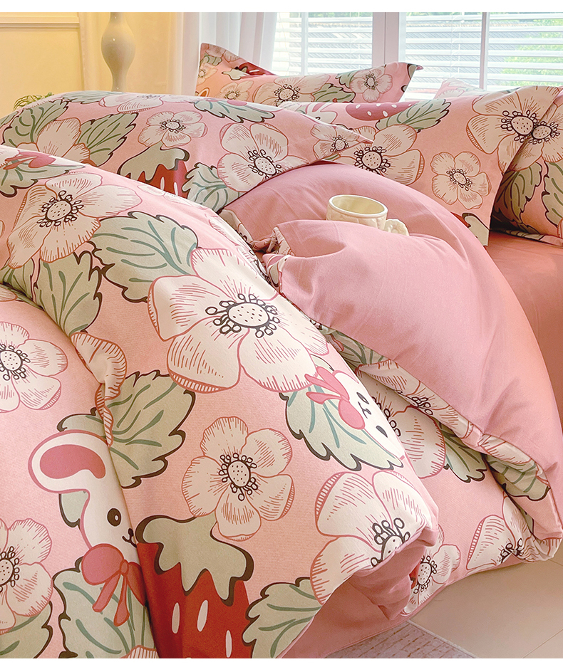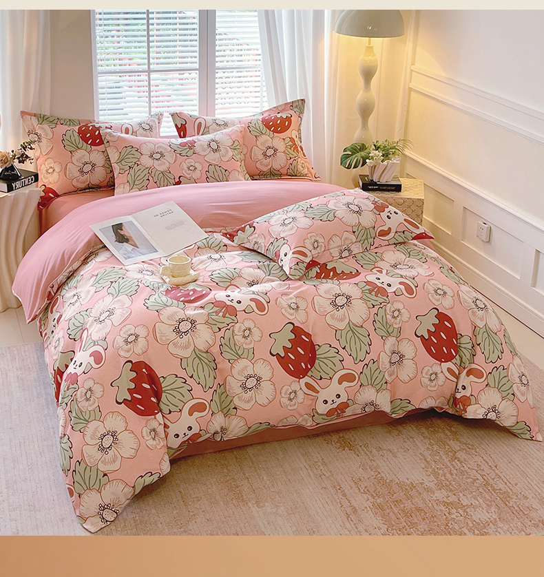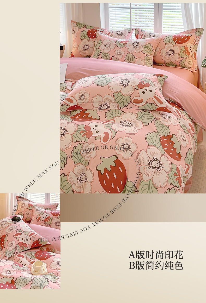 当前位置:凯磊家纺 > 凯磊家纺 2025新款AB版加厚磨毛系列四件套 草莓小兔粉