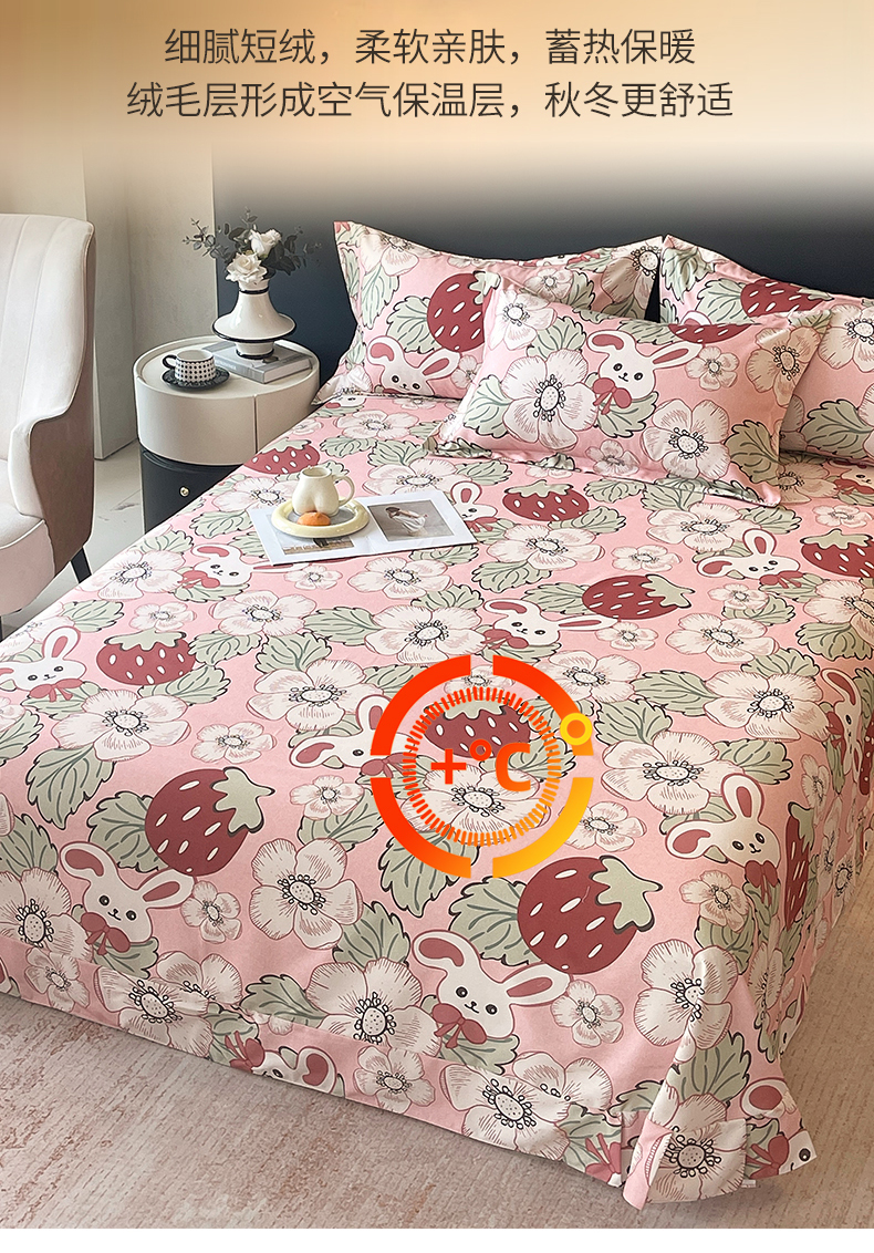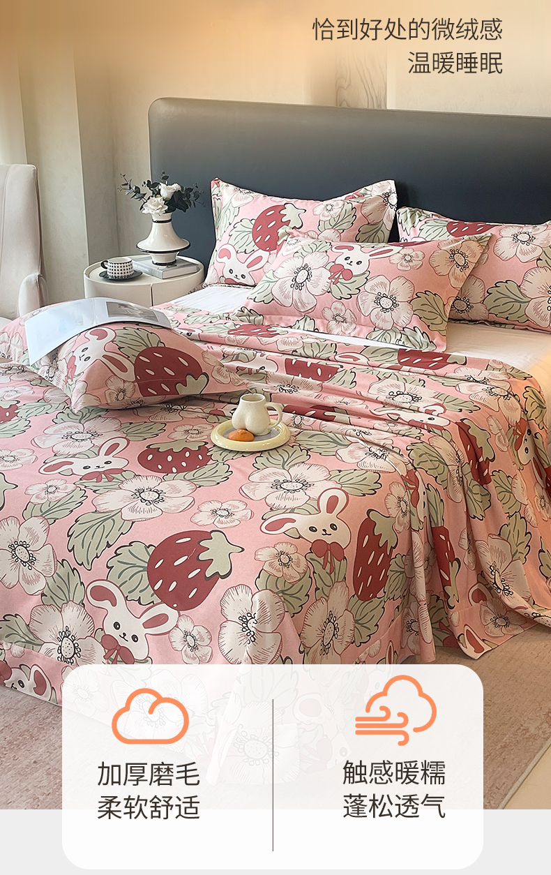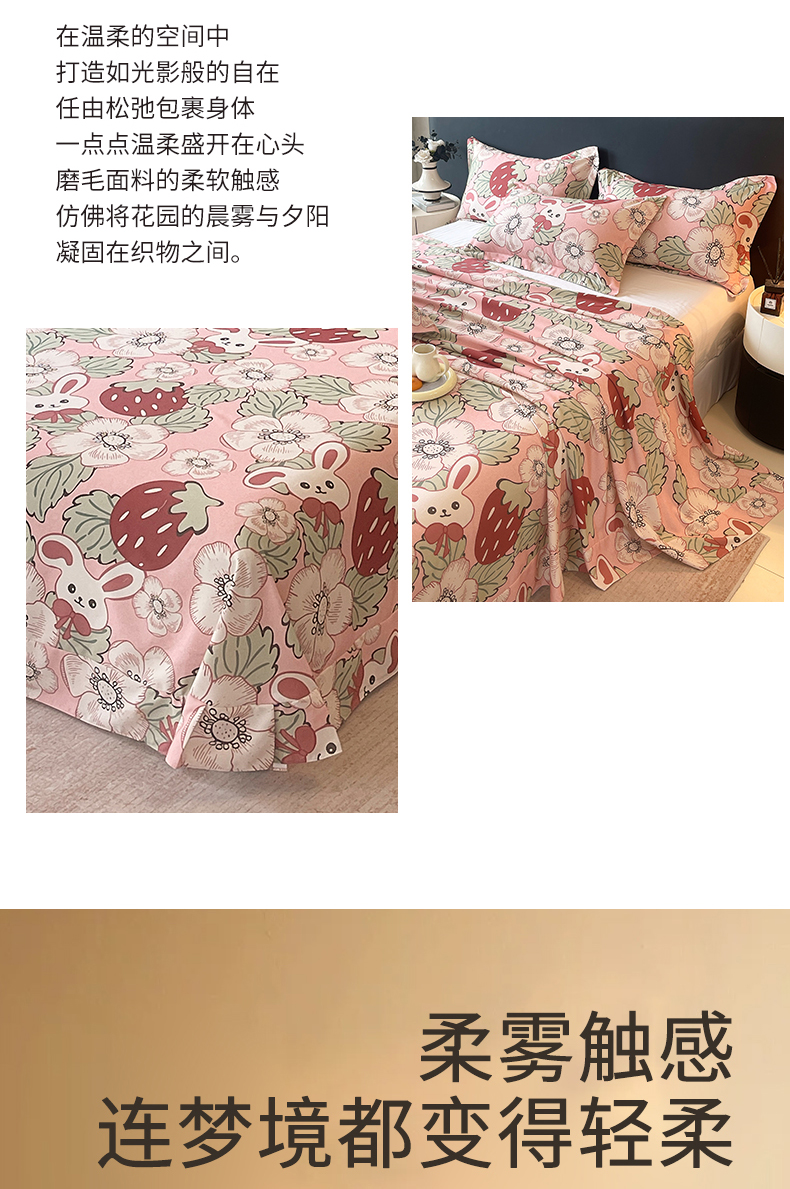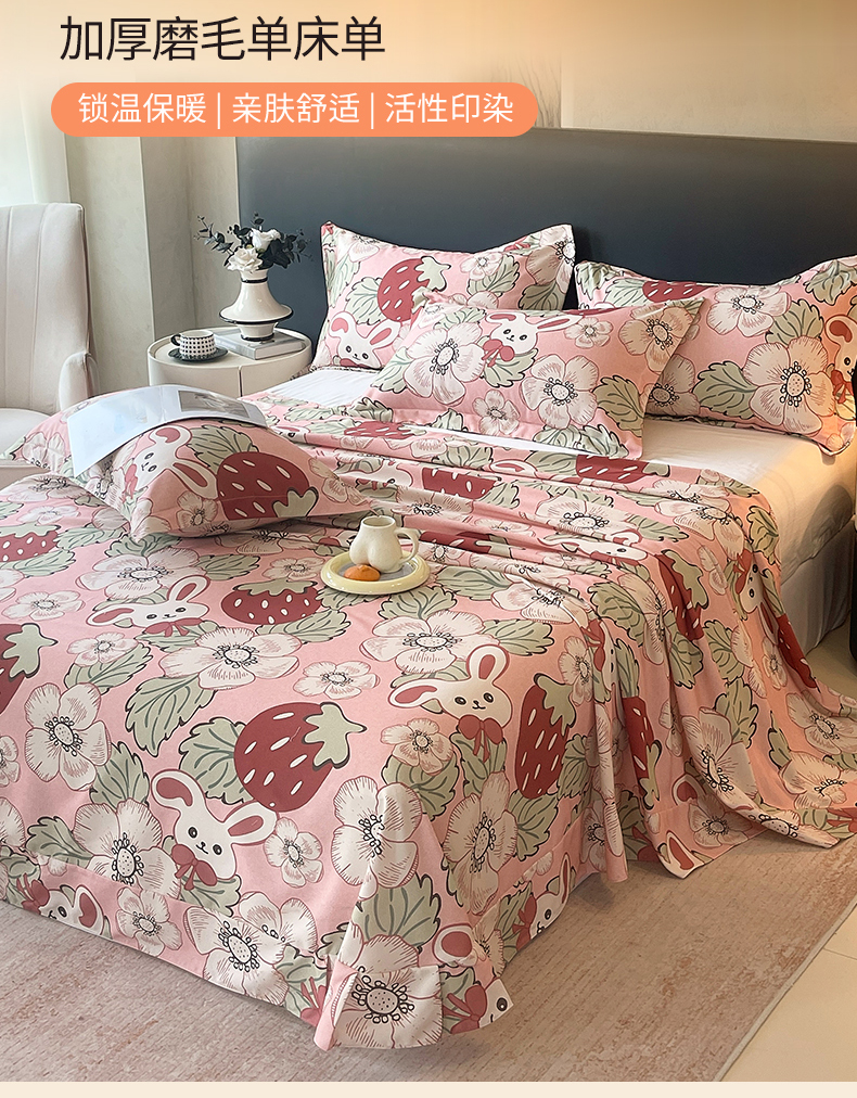 凯磊家纺 2025新款AB版加厚磨毛系列单床单 草莓小兔粉