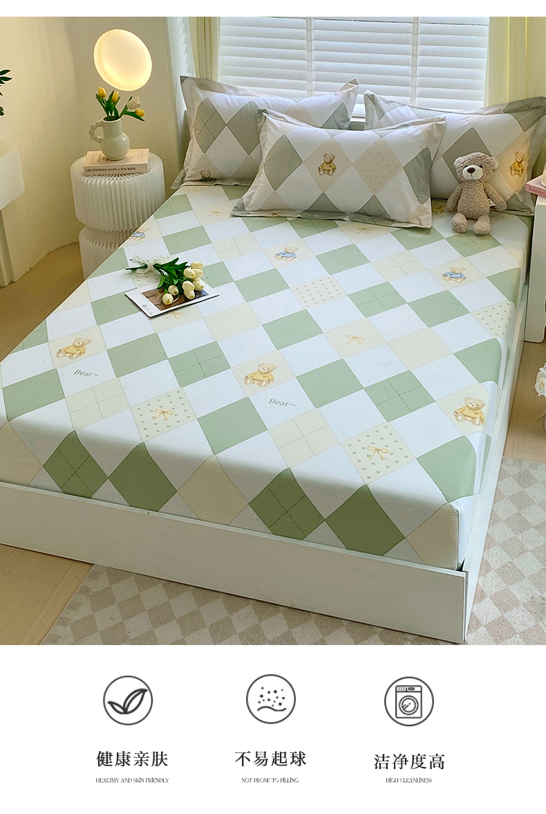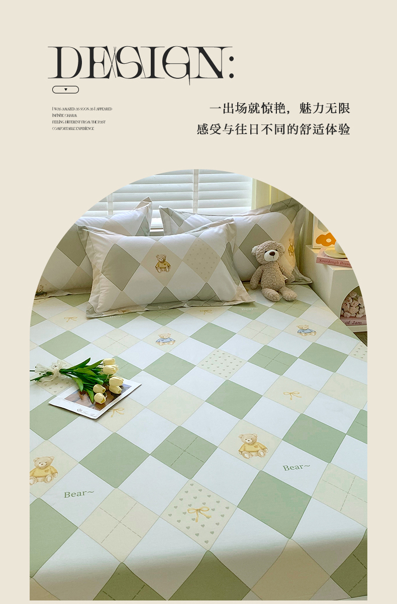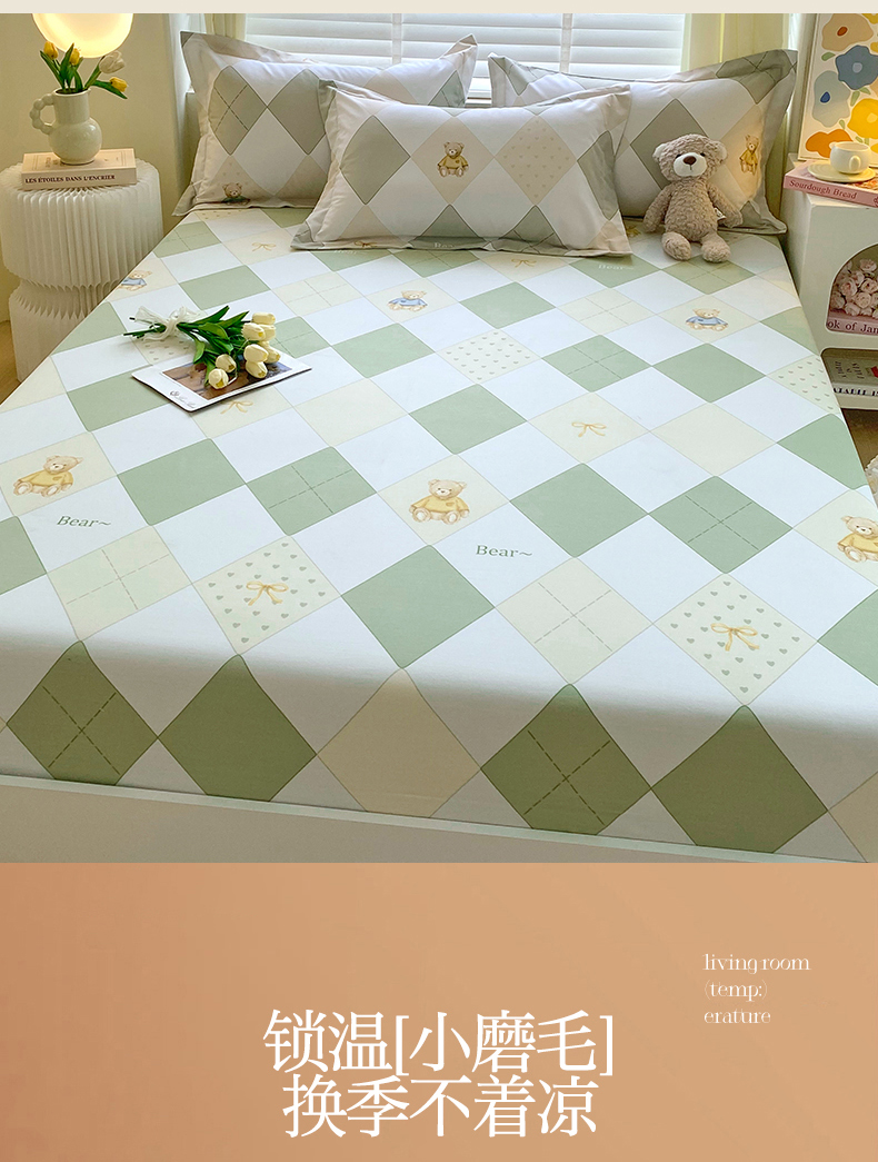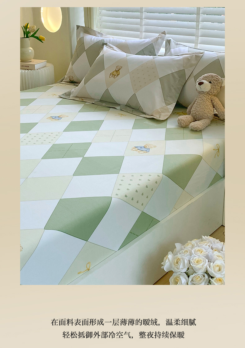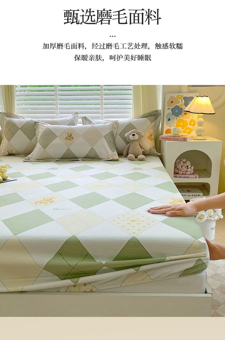 凯磊家纺 2025新款AB版加厚磨毛系列单床笠 格子小熊-绿