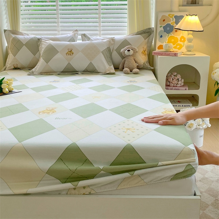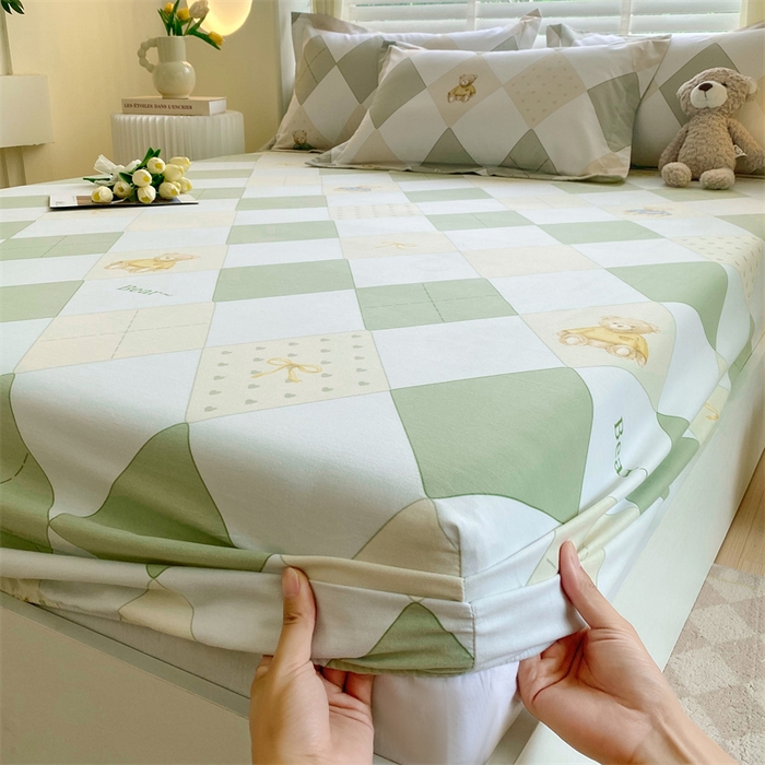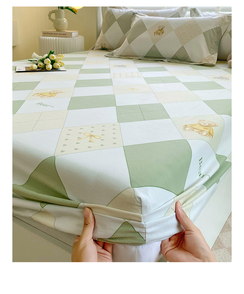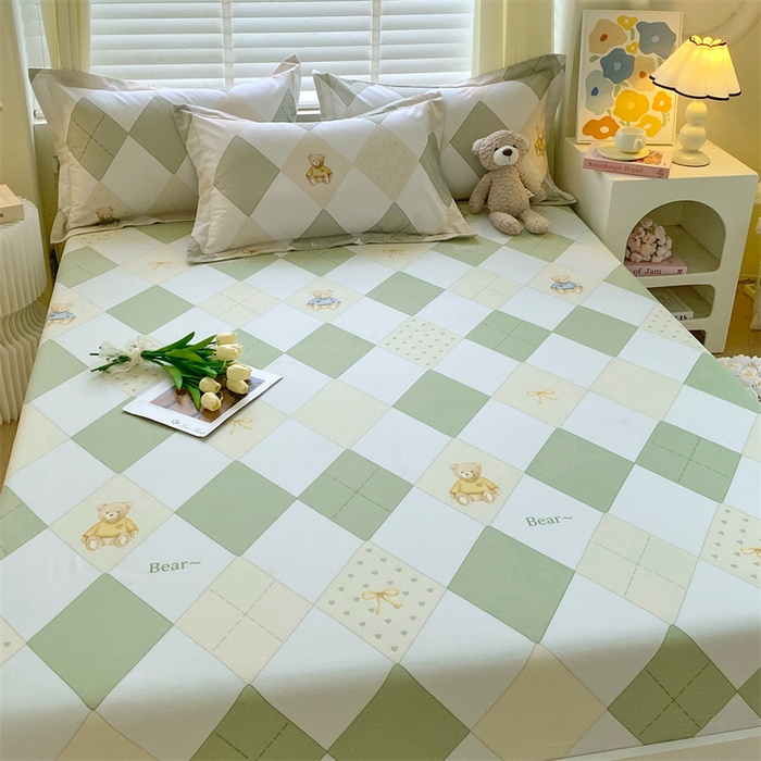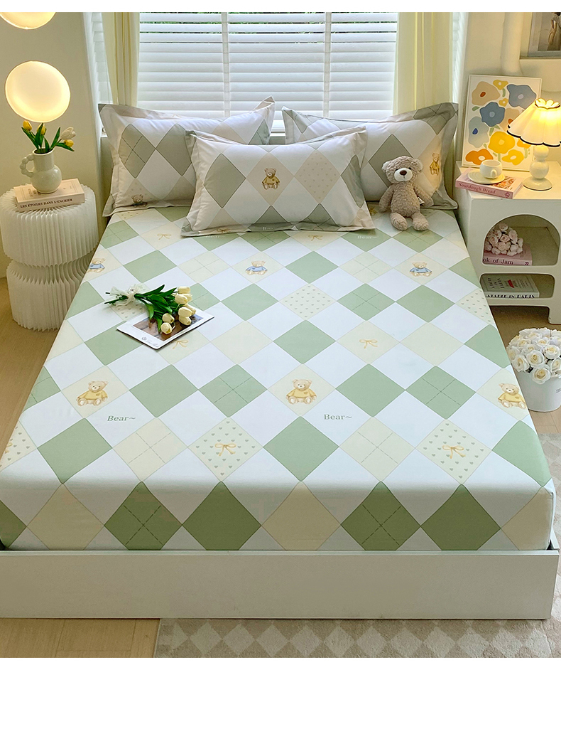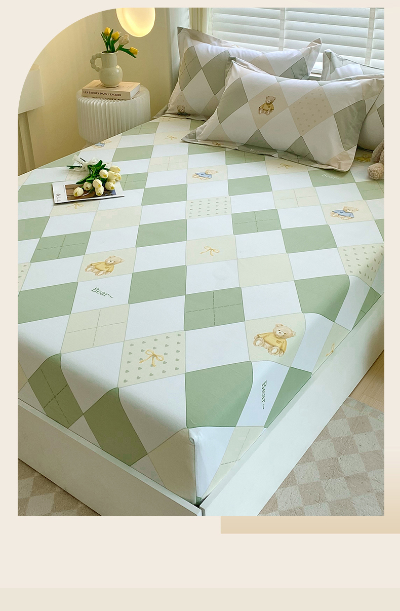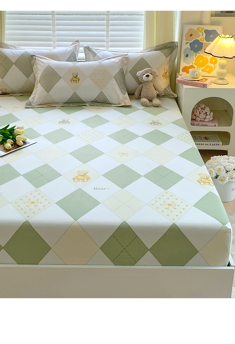 凯磊家纺 2025新款AB版加厚磨毛系列单床笠 格子小熊-绿