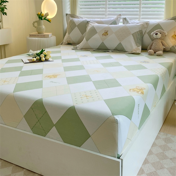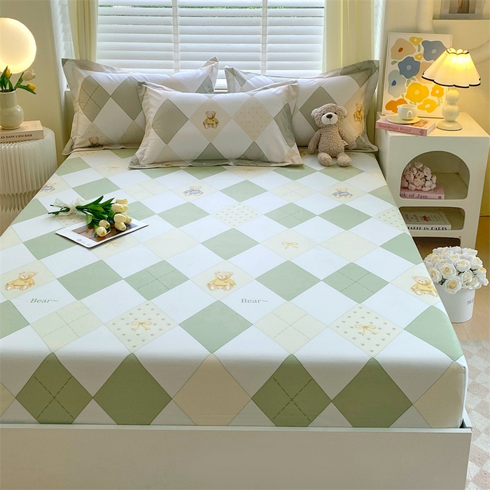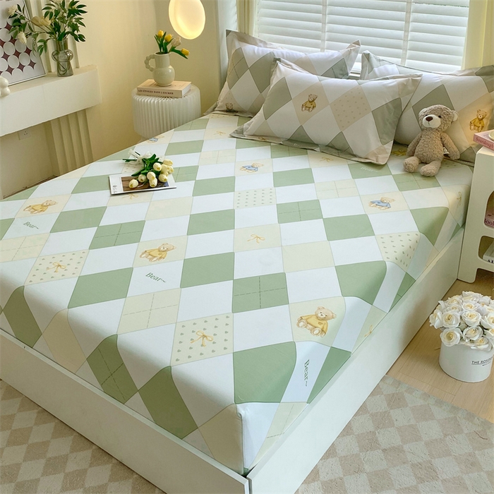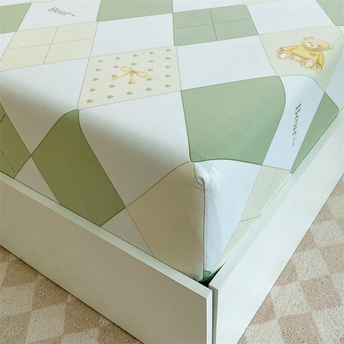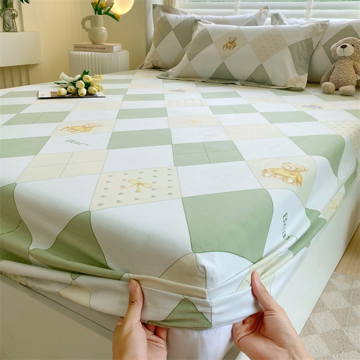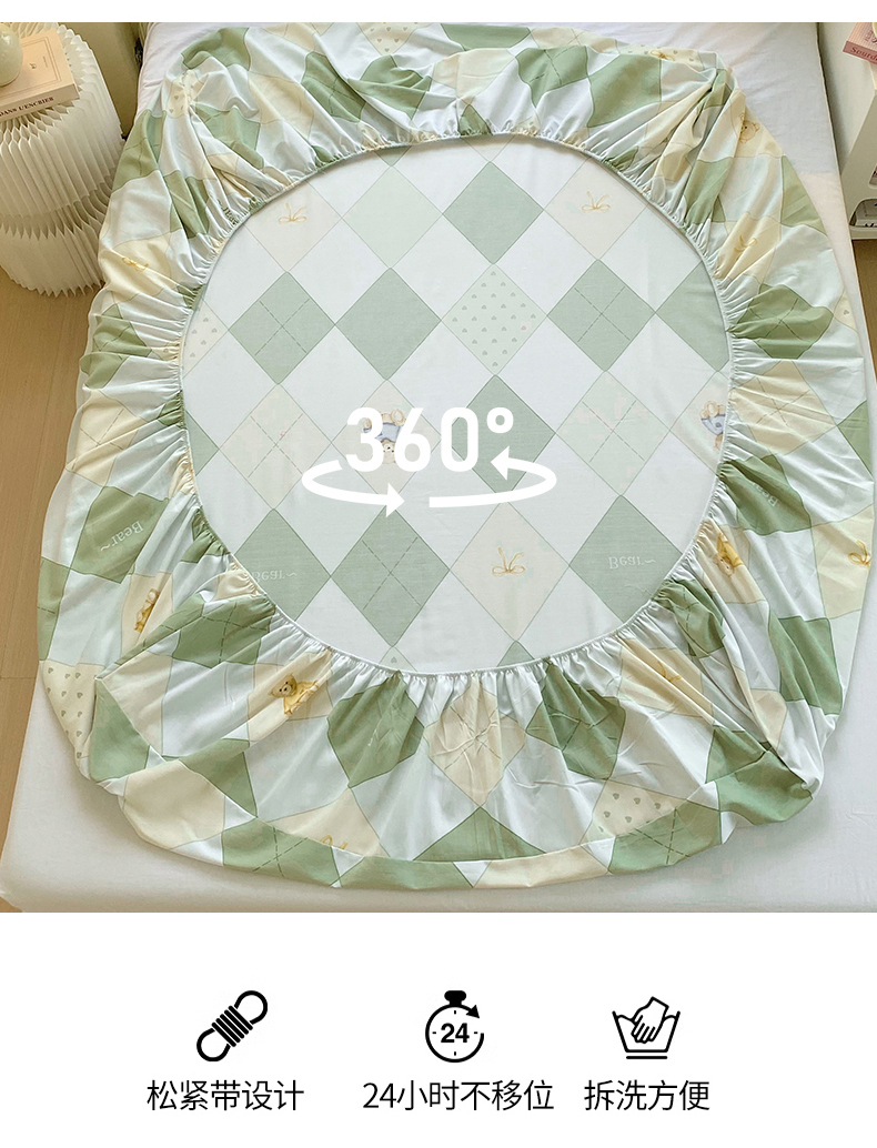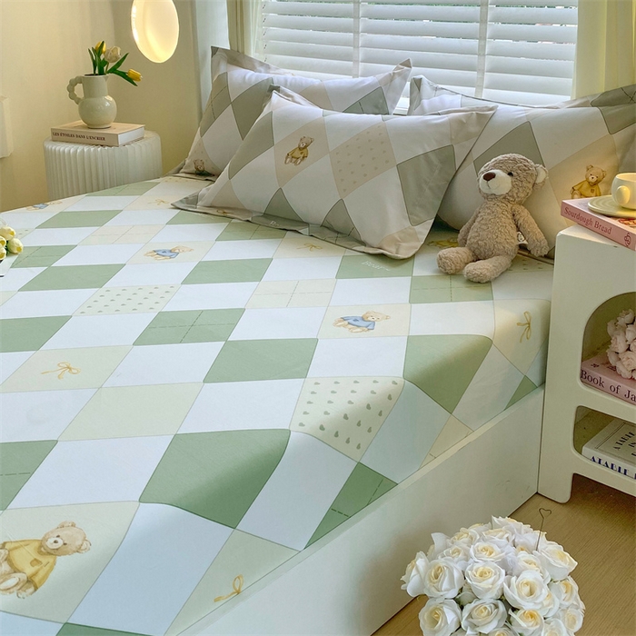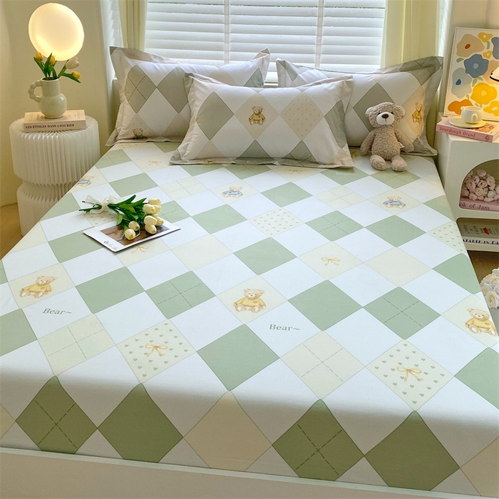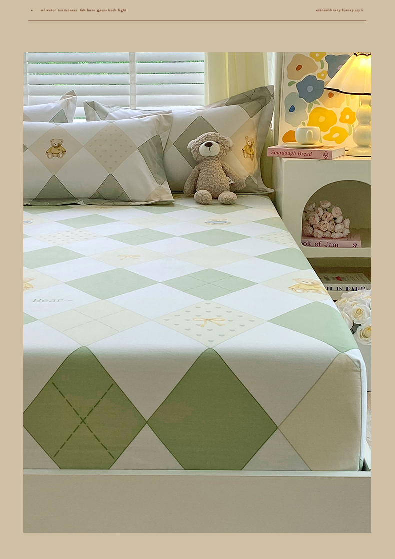 凯磊家纺 2025新款AB版加厚磨毛系列单床笠 格子小熊-绿