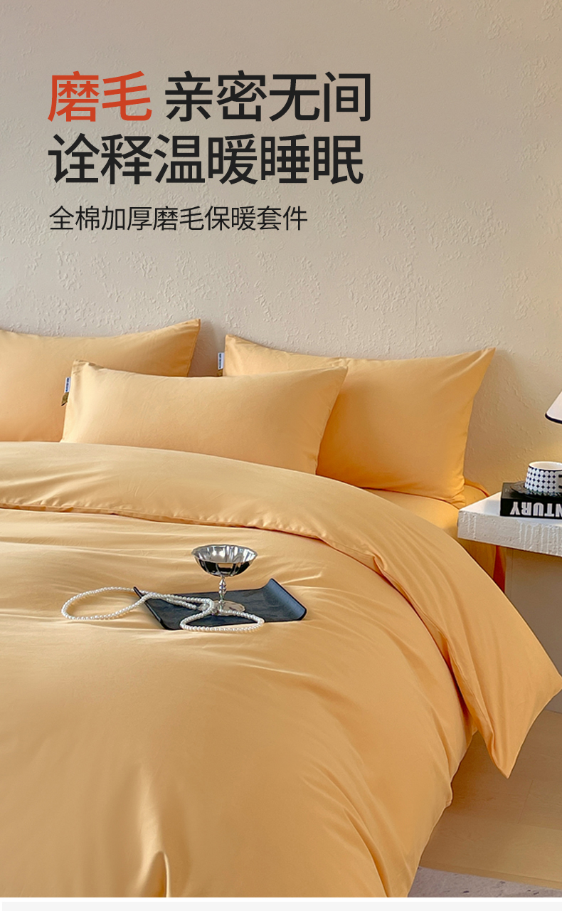 当前位置:凯磊家纺 > 凯磊家纺 2025新款加厚磨毛纯色系列四件套 栀子黄