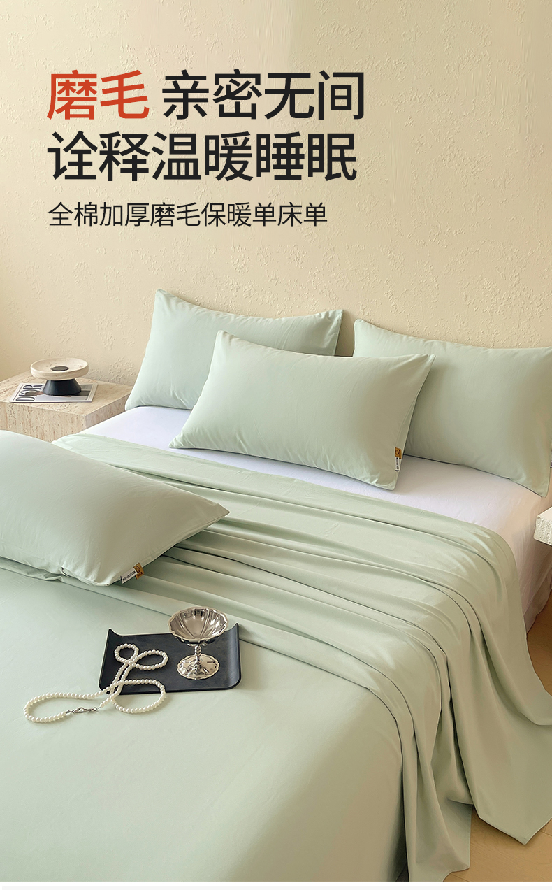> 凯磊家纺 2025新款加厚磨毛纯色系列床单 春日绿